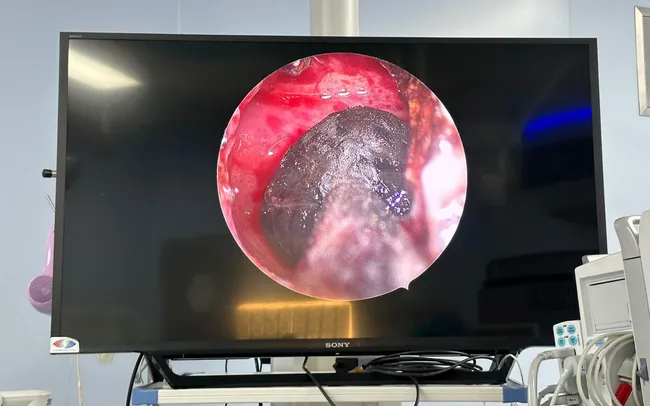 Bệnh nhân được chẩn đoán theo dõi nấm xoang bướm phải, các bác sĩ Khoa Tai Mũi Họng thực hiện phẫu thuật nội soi mở thông xoang bướm, quan sát thấy có khối nấm kích thước 1x1 cm giống như "hòn bi", màu nâu đen hình cầu bề mặt nhẵn, cứng chắc.