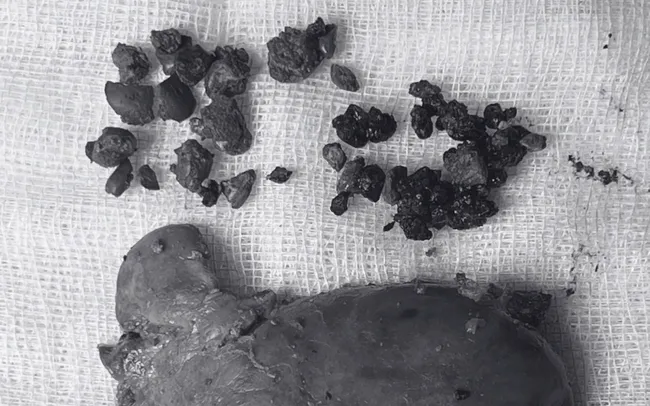 Hình ảnh sỏi và thùy gan trái được cắt bỏ của bệnh nhân.
