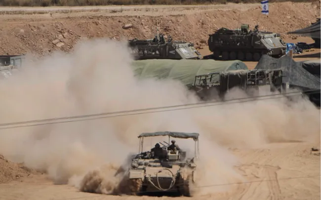 Xe quân sự Israel được triển khai gần biên giới với Dải Gaza, ngày 20/5 (Ảnh: THX/TTXVN)